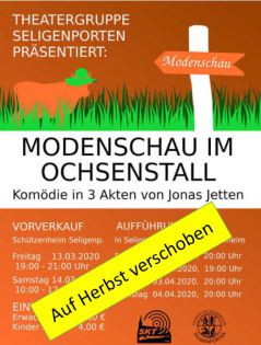 Um der vorrangigen Gesundheitssicherheit der Bevölkerung Rechnung zu tragen, werden die Aufführungen der Theatergruppe Seligenporten auf den Herbst 2020 verschoben.